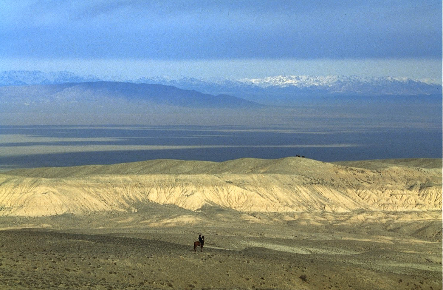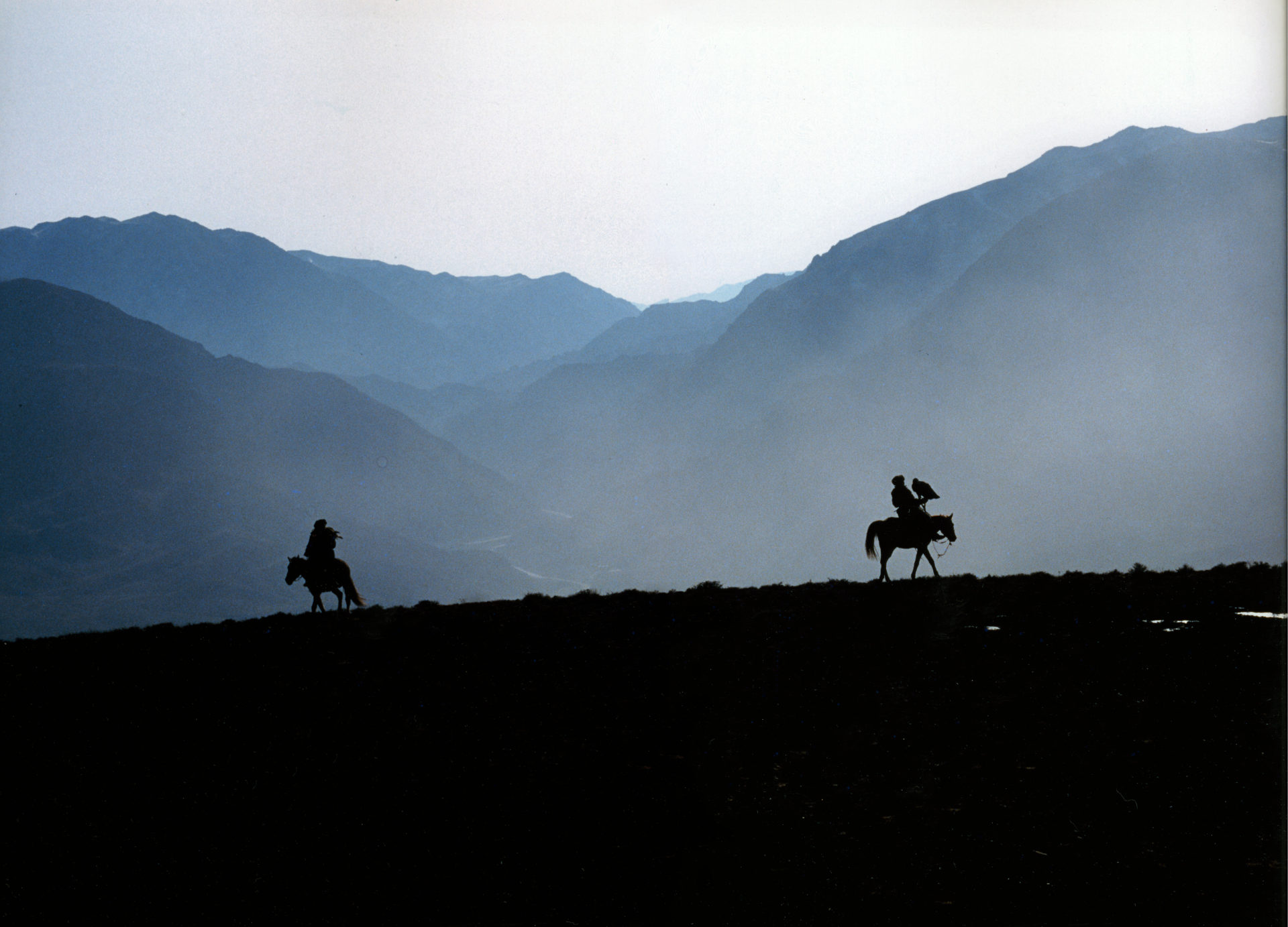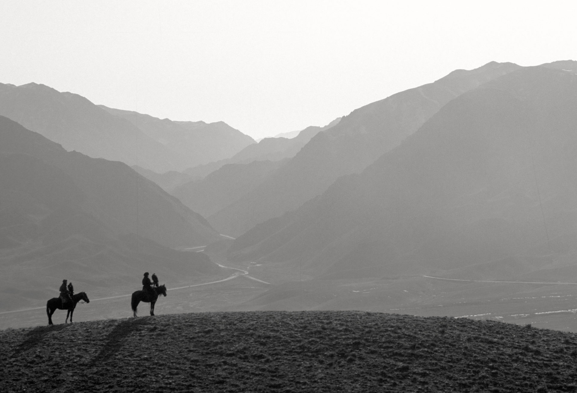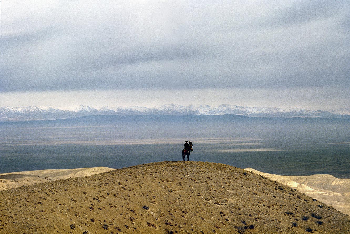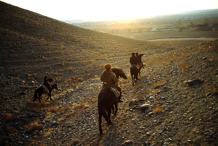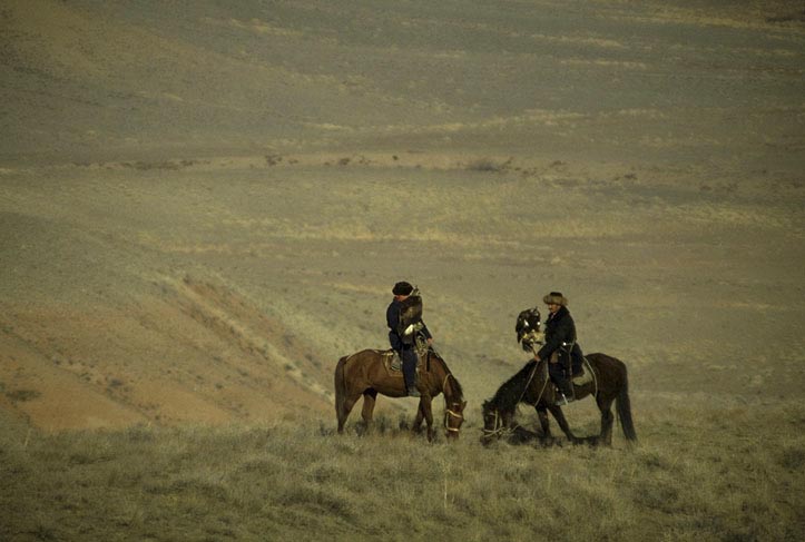 Fauconnier Kazakh, en fond la frontière chinoise