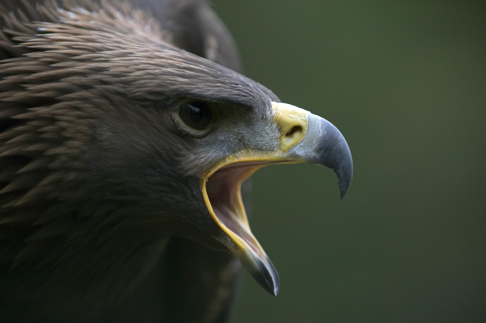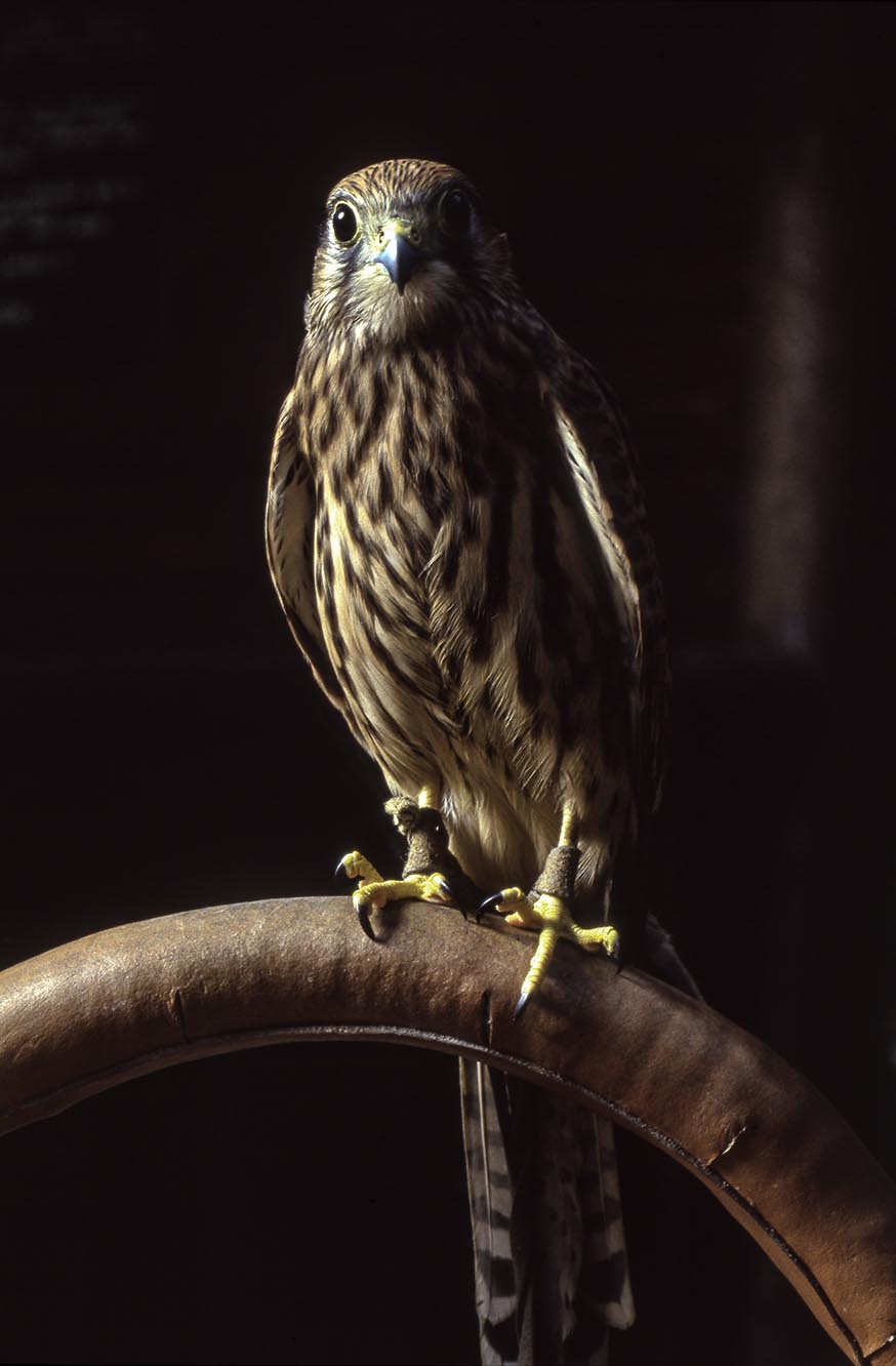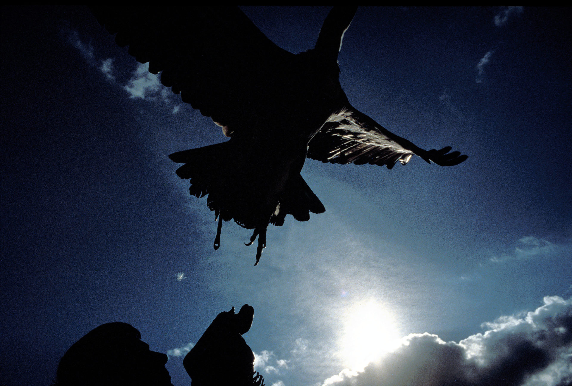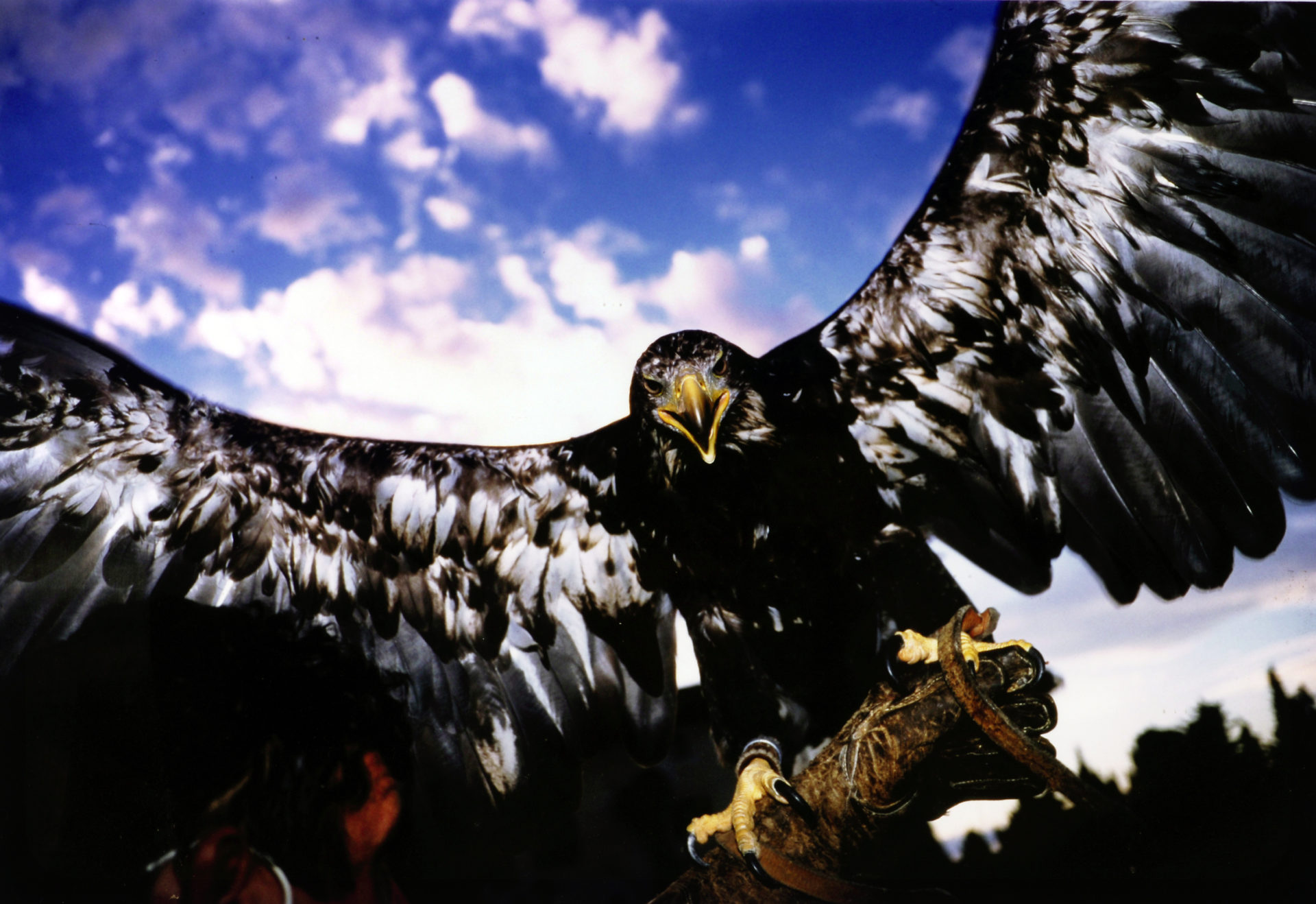 Aigle en vol avant de se poser sur le gant du fauconnier